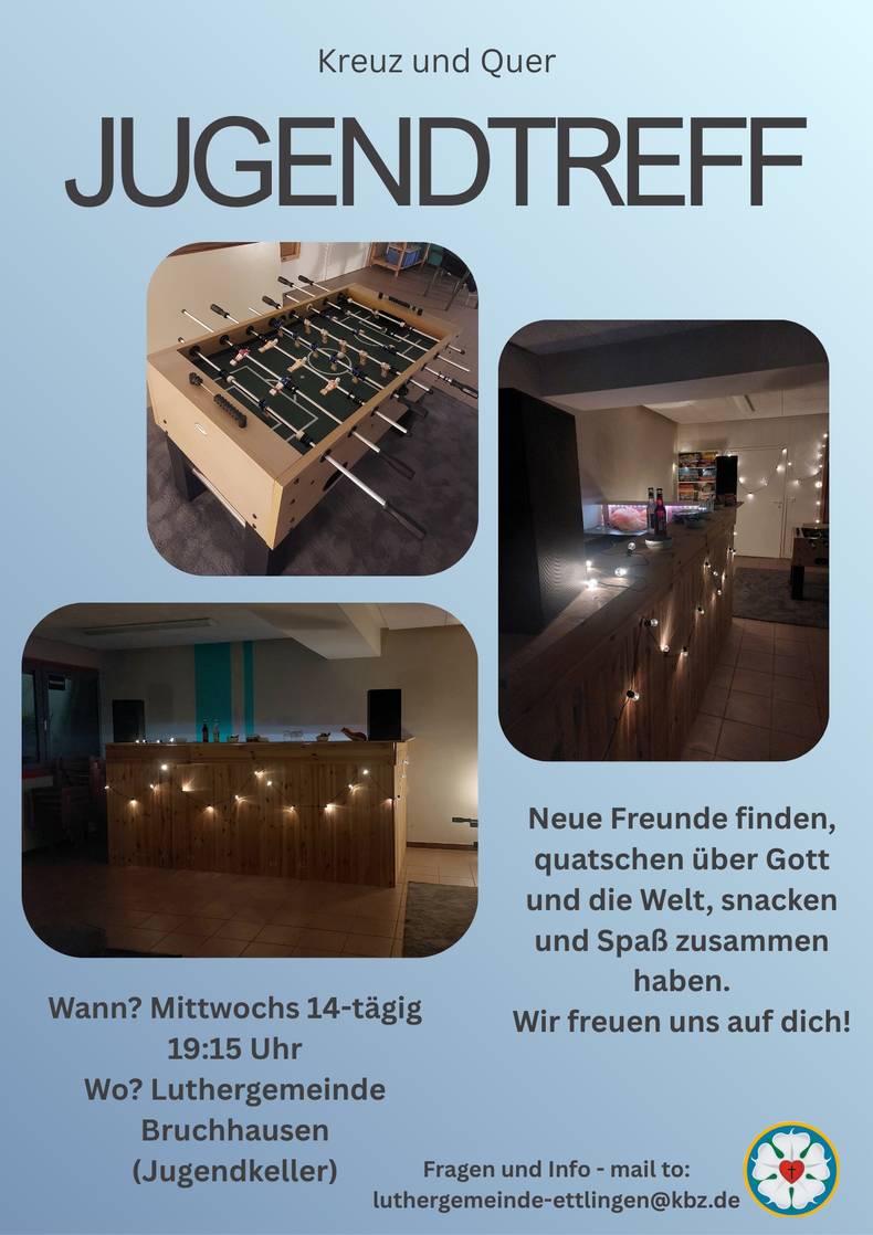 Der Jugendtreff findet alle zwei Wochen mittwochs um 19:15 Uhr im Jugendraum des Gemeindezentrums Bruchhausen statt.